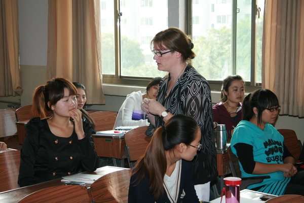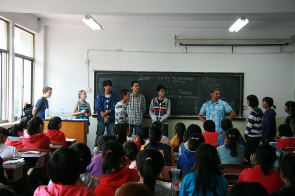 除了走入课堂之外,该交流小组成员还应邀在分别在9月10日和12日晚为公司一年级新生和大二、大三员工开展了两场英语角活动,向同学们详细介绍美国的习俗文化,耐心回答同学们的各种问题。本次活动为同学们提供了近距离了解西方社会文化的机会,令同学们开阔了眼界,提高了学习英语、了解西方文化的兴趣和热情,受到了同学和老师们的热烈欢迎。