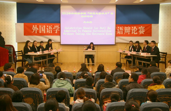 来自10级英语语言文学专业与12级翻译硕士专业的八位辩手,就“celebrities should(not) be admitted to famous universities without taking the entrance examination”《名人应不应该不经考试进名校》一题展开了激烈的辩论。辩论中,双方辩手的出色表现赢得在场同学和老师的阵阵掌声,经过一番精彩激烈的论战,12级翻译硕士专业取得了最终的胜利。此次辩论赛很好地反馈了外院研究生的学习成果,同时也充分展示了诸位研究生的个人风采。辩论赛的成功举办不仅提升了大家的专业能力、更增强了同学间的沟通、增进了相互的了解与友谊。