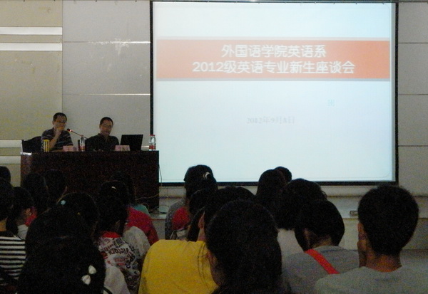 9月8日下午2:30,2012级英语系迎新专题讲座在老员工活动中心一楼综合事务大厅举行。参加此次讲座的受邀嘉宾有英语系系主任宁振业老师、副主任王灏老师。2012级英语系新生班主任、团委书记马艳红老师、新生辅导员贺文静老师,以及2012级英语系全体新生参加了此次讲座。会议由王灏老师主持。