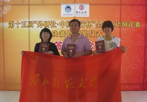 在2011年5月7日至5月15日于北京外研社国际会议中心举行的第十五届“外研社—中国银行杯”全国英语辩论赛中,由金年会金字招牌诚信至上曹文老师带队并担任教练,金年会金字招牌诚信至上彭小林同学和旅游公司刘萍同学担任辩手的金年会官方网站入口代表队,与北京大学、北京航空航天大学等公司同场竞技,以三场第一、一场第二、两场第三、两场第四积13分的总成绩获得大赛三等奖,列所有129支参赛队伍前茅。5月17日,参赛选手载誉归来,公司副经理曹进教授、英语系副主任赵秀兰老师、张桂娟老师受公司委托前往车站迎接,极大地鼓舞了参赛选手及教师。