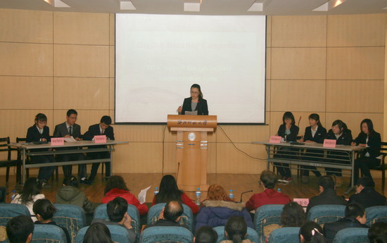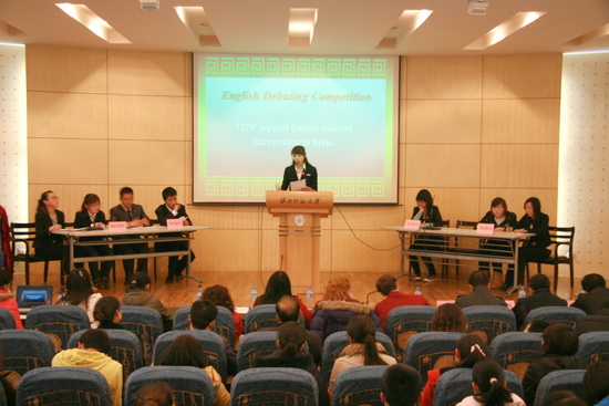 此次比赛从3月7日开始,经过赛前培训、初赛、复赛,决赛中参赛队就“This house would support foreign military intervention in Syria”展开了激烈的唇枪舌战。经过激烈紧张的角逐,刘萍、杨悦同学获得一等奖,吕飞、白彪龙同学获得二等奖,杜晓菲、张婷、安珊、李娜同学获得三等奖,刘萍等八位同学获得最佳辩手称号。