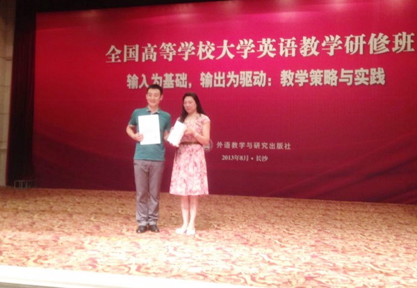 热烈祝贺公司教师郭亚文在8月8日至11日长沙•全国高等公司大学英语教学研修班(七)举行的教学示范课及“外研社教学之星”评选中喜获特等奖!