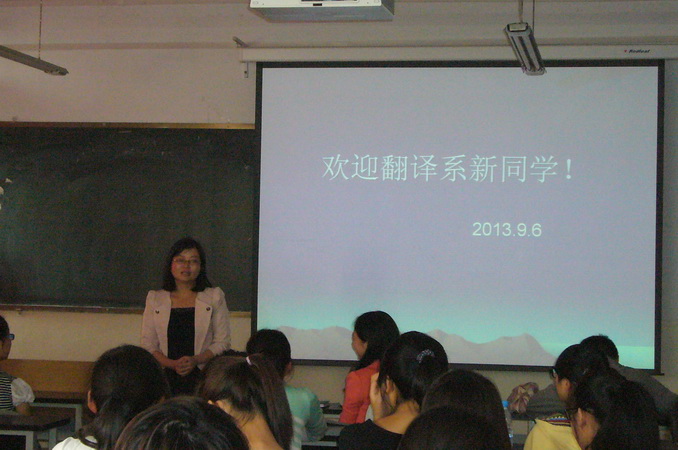 2013年9月6日下午3:00,翻译系2013级本科生迎新专题讲座在教学3号楼605教室举行。翻译系系主任董晓华老师、副主任杨晓红老师、2013级翻译2班班主任保菁菁老师、以及2013级全体翻译专业员工参加了此次讲座。此次讲座由董晓华老师主持。