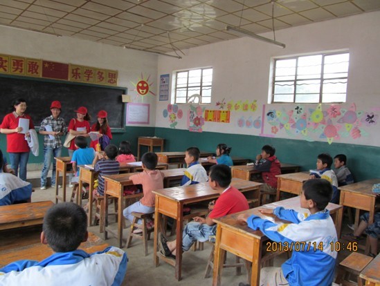 我们的员工是三、四年级的小朋友。可喜的是,员工的学习热情都很高,都与我们配合得很好。语文课上,我们给三年级的员工复习了音节(声母、韵母、音调);纠正了他们发音中最大的问题“n”和“l”的辨音;前后鼻音的区分;我们用谜语和脑经急转弯来锻炼他们的思维能力和应变能力;和他们一起学习成语和成语背后的故事;教他们如何去朗诵诗歌。数学课上,我们讲了相对高度、间隔等问题,让他们感受生活中的数学,并且帮他们复习了乘法表,指导了暑期作业。英语课上,我们为班上的每个孩子都取了英文名字,给员工教了常用的英语对话:四季、星期和月份的英语表达,还给他们教了好听的英文歌曲,以培养他们学习英语的兴趣。四年级员工英语课上,我们教了最简单基础的音标,简单的口语表达;语文课上主要教了修辞的使用,着重纠正了他们的发音;数学课上讲解了生活中的数学运用,培养他们对数学的兴趣;音乐课上教了简单的乐谱,还有古诗词改编的歌曲(《水调歌头》),还有一些简单的英文歌曲;体育课上教了打乒乓球的标准姿势、积分规则等等。更值得一提的是,我们的实践队员每天会跟着员工让他们进行半小时的早读,明确他们的早读任务。