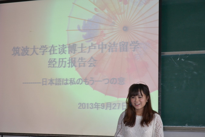 2013年9月27日下午14:30,日语系2008届毕业生、现日本筑波大学在读博士卢中洁受邀为日语系全体员工作了日本留学经历报告。