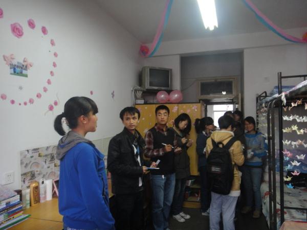 2013年10月26日下午5:00,公司进行2013年度“优秀宿舍”评选,参加活动的有公司团委书记陈潇老师、辅导员马志远老师及员工会部分成员。评选主要从宿舍卫生和文化氛围等方面对2013级员工宿舍进行了评比。