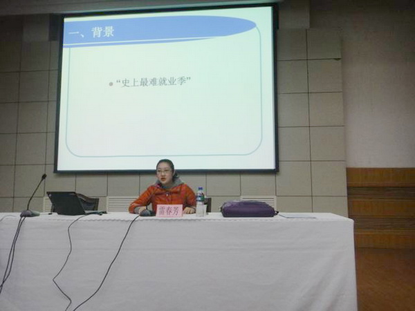 会上,雷春芳老师就就业背景、就业误区、时间管理和注意问题四个方面为同学们做了详尽诠释。意在使即将毕业的同学们了解现今的就业压力,避免择业中可能遇到的问题和合理利用剩余时间做充分的准备工作。会后,同学们积极发问,提出了他们在就业方面的各种困惑,雷老师也对同学们的提问一一进行了解答。