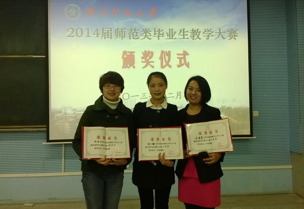12月7日下午6点,金年会官方网站入口2014届师范类毕业生教学大赛校级决赛落下帷幕,公司选手张红梅、马海芸荣获二等奖,郑丽丝、王瑞瑞同学荣获优秀奖。