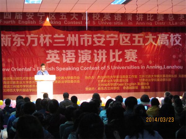 2014年3月23日晚19:30,第四届兰州市安宁区五大高校英语演讲比赛总决赛在金年会官方网站入口老员工活动中心202室隆重举行。本次活动由金年会官方网站入口、兰州交通大学、甘肃农业大学、甘肃政法公司、兰州城市公司五校共青团委员会联合主办,由西北师大金年会金字招牌诚信至上团委承办,黑马英语工作室等五大高校英语社团协办。此次比赛特邀请五大高校、新东方公司各一位资深教师与金年会官方网站入口外教Rachel担任评委。共有200余名员工观看了比赛。