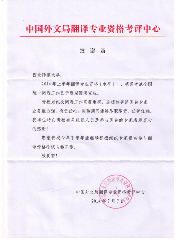近日,中国外文局翻译专业资格考试中心向公司发来致谢函,对公司积极协调组织、协助完成2014年上半年翻译专业资格(水平)考试笔译口译阅卷工作表示感谢,并对参与阅卷工作的教师表示感谢,同时期望公司今后能够继续参与翻译资格考试的阅卷工作。