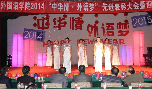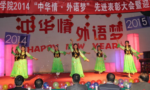 表彰大会结束后,动感十足的开场舞拉开了迎新晚会的序幕。晚会上,传统的少数民族歌舞与时尚的外语类节目相结合,既让观众体验到了少数民族的风情,又让大家享受到了异域异国的风韵;极具“笑”果的方言版朗诵《我的滑板鞋》让晚会逐渐升温,研究生带来的精彩舞蹈《咏春》更让大家感受到了柔情的中国风。另外,由员工会同学演绎的小品《过河》,带大家重温了经典,台下也是掌声不断,笑声连连。而外院师生联袂带来的伦巴舞蹈更让同学们看到了平日里严谨的老师们热情洋溢的一面。更有公司各系老师用英语、俄语、日语、阿拉伯语、法语、中文六个语种共同演绎的《Let it Go》,彰显了外院特色,赢得掌声不断。晚会最后,团委员工会同学们的一首饱含深情的诗朗诵《书海灯塔—至吾师》,表达了同学们对老师们深深的崇敬与感谢。