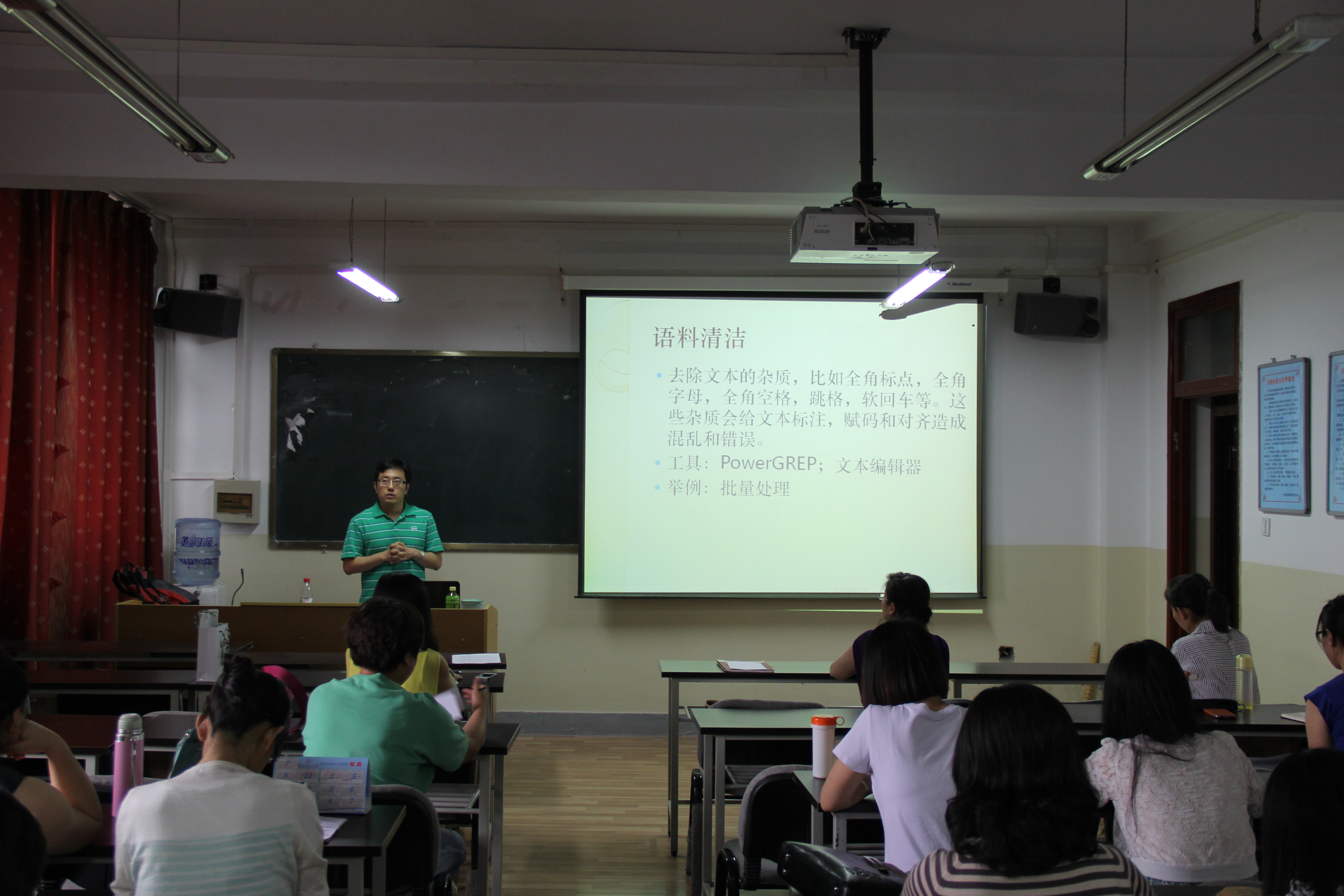 然后,崔挺老师做了题为“平行双语语料库建设与应用”的学术报告。报告主要从建设平行双语语料库的必要性、阶段划分和应用三方面展开。在此基础上,崔老师结合自己正在建设的有关“政府工作报告”的平行双语语料库,详细演示了建设平行语料库的过程,如语料的清洁、标注、对齐等。他指出Trados软件对于建设平行语料库非常有用。报告结束后,崔老师与参会师生进行了互动交流,并展开了热烈讨论。通过本次研讨,与会师生一致认为崔老师的学术研究与报告对于翻译实践,尤其是翻译教学具有一定的启发性,对今后公司语料库的应用与研究具有积极的推动作用。