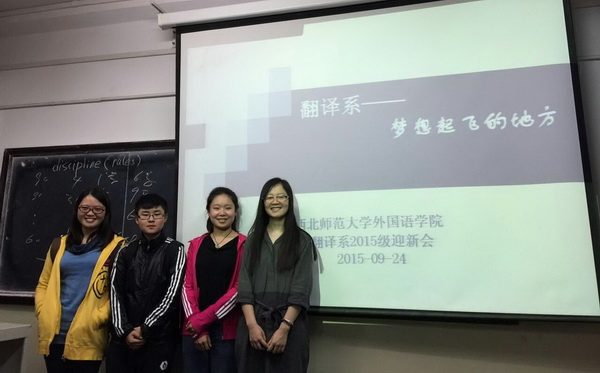 9月24日晚,翻译系在3号楼409教室举行了以“放飞梦想”为主题的迎新会。翻译系负责人董晓华老师、王蕾老师和尹鹏老师、2015级翻译系全体员工以及4位2012级员工参加了主题会,会议由董晓华老师主持。