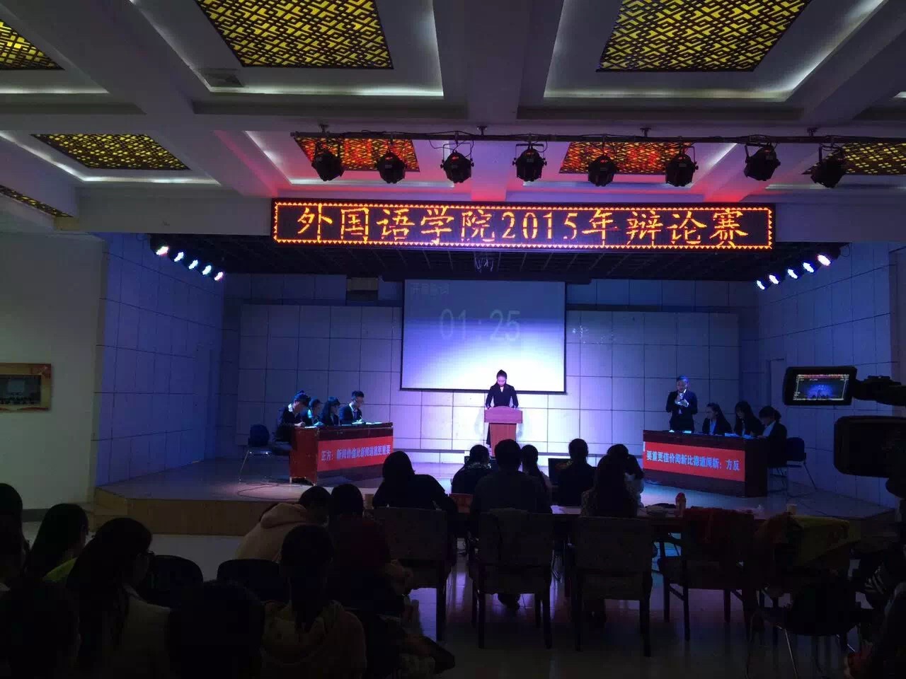 经过一个多月初赛、复赛、半决赛的层层选拔,有四个班级代表队入围决赛。决赛分两场进行。首场季军争夺赛由2015级英语4班对阵2015级翻译1班,正反双方围绕“挫折是否有利于成才”主题展开激烈辩论。辩手们思维活跃、逻辑缜密,让在场观众赞不绝口;第二场期待已久的冠军争夺战由2015级英语1班和2015级翻译2班打响,双方就“新闻价值与新闻道德哪一个更重要”展开“论战”,双方辩手旁征博引,妙语连珠,让现场气氛高潮迭起。比赛间隙穿插了趣味辩论表演赛,辩手们幽默的话语引来场上笑声不断。