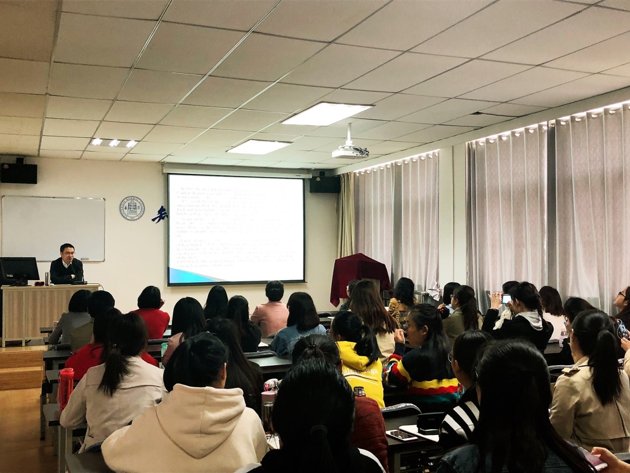 高育松教授首先介绍了研究背景,比较了母语习得和二语习得在词缀知识习得方面的异同,然后通过分析2017年高考英语全国Ⅱ卷短文单词填空题考生的答题情况,调查了中国员工的英语词缀知识现状及存在的问题。在具体语料分析中,高教授从词缀句法知识、词缀分布知识、屈折语素与派生语素混用三个方面入手,生动地分析了词缀误用的具体情况,并提出了“屈折语素优先策略”的观点。最后,基于研究发现,高教授为词缀知识教学提出了几点重要且实际的建议,并与在座师生分享了后续值得研究的问题,使老师和同学们深受启发。