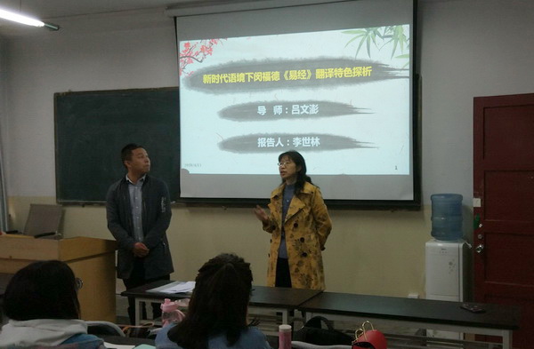 李世林同学选取闵福德和我国傅惠生教授的不同英译本进行比较,通过典型的译例分析,指出闵福德采用“异化”为主的翻译策略和“直译+释译”为主的翻译方法,其英译的特点在于审美价值的重构、经文的正本清源、文化意象的保留以及经传的通俗易懂;体现了语言风格的易与繁、诗学价值的呈现、文化意象的对等、评论注释的详尽等翻译特色。另外,他还介绍了自己读研的心路历程,他说:对于研究生来说,研究兴趣、请教、计划、做笔记、有效利用图书馆、参加各种学术活动、研读论文等,都非常重要,我从中受益匪浅。