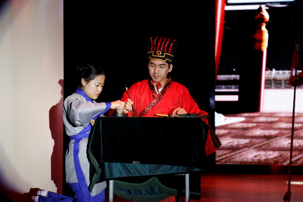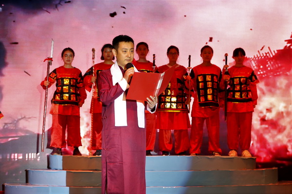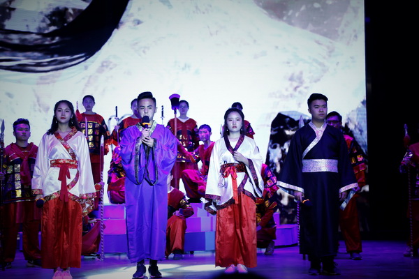 “孔明挥笔疾书,上书表文,为光复先帝遗志夜不能寐;众将士披坚执锐,昂首阔步,为捐躯报国,兴复汉室而整装待发;后主刘禅为相夫送酒壮行……”《出师表》结合公司专业特色,采用中英双语朗诵,师生合作的形式,由公司英语系教师郭亚文进行英文领诵,配合来自不同专业的近三十名员工的朗诵、表演,音、诗、画的完美结合,让尘封的历史画卷被再次翻开,赢得现场观众的阵阵掌声。
