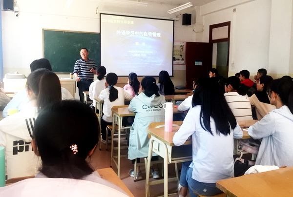9月20日下午14:30,英语系专业导读课在教学3号楼305教室正式开始。公司经理曹进教授作了题为“外语学习中的自我管理”的讲座,2018级英语专业“云亭班”全体员工聆听了此次讲座。