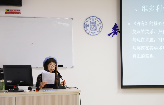 报告会上,蒋老师分别从维多利亚时代与现代之间、拒绝当下与拯救过去、情节编排与叙事欲望、一致性与终结四个方面讨论了A.S拜雅特的《隐之书》中所呈现的叙事欲望的问题。首先,蒋老师谈到拜雅特在《隐之书》中对维多利亚时代诗人艾许的腹语诗给予了充分认可,并且对罗兰和莫德建构的爱情故事也全然接受,显示出其创造真实历史叙事的可能性。其次,《隐之书》的核心主题是探讨过去与现在之间错综复杂的关系,拜雅特将文学与理论并置,将过去与现在并置,对后者持有摒弃的态度。再次,蒋老师着重探讨了拜雅特在情节编排上反映出的叙事欲望。情节能够赋予本无意义的事物以意义,而叙事是赋予欲望的一种方式。最后,蒋老师对该问题作了总结,即拜雅特相信叙事能够重新建构过去,也相信作者能够将历史事件编织进一致性的叙事中,从作品情节编排上能够获悉作家的叙事欲望。