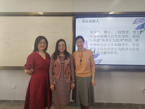然后,罗静同学介绍了她们师生的具体研究过程。她们以“译者行为批评”为理论框架,采用“求真-务实”译者行为连续统评价模式,译内译外相结合,以苏轼《水调歌头·明月几时有》11个英译本为例,描述并对比分析了中外两个译者群英译文化意象“天”的行为。研究结果表明,在“求真-务实”译者行为连续统评价模式下,外国译者群的行为总体上偏于“求真”,而中国译者群的行为却总体偏于“务实”。该发现符合“求真为本,务实为用(上)”的译者总体行为规律。鉴于“天”在中国文化中内涵之特殊性,研究者提出,将“天”音译为Tian,并加注,以期对中国文化其他核心关键词的翻译有所启迪。