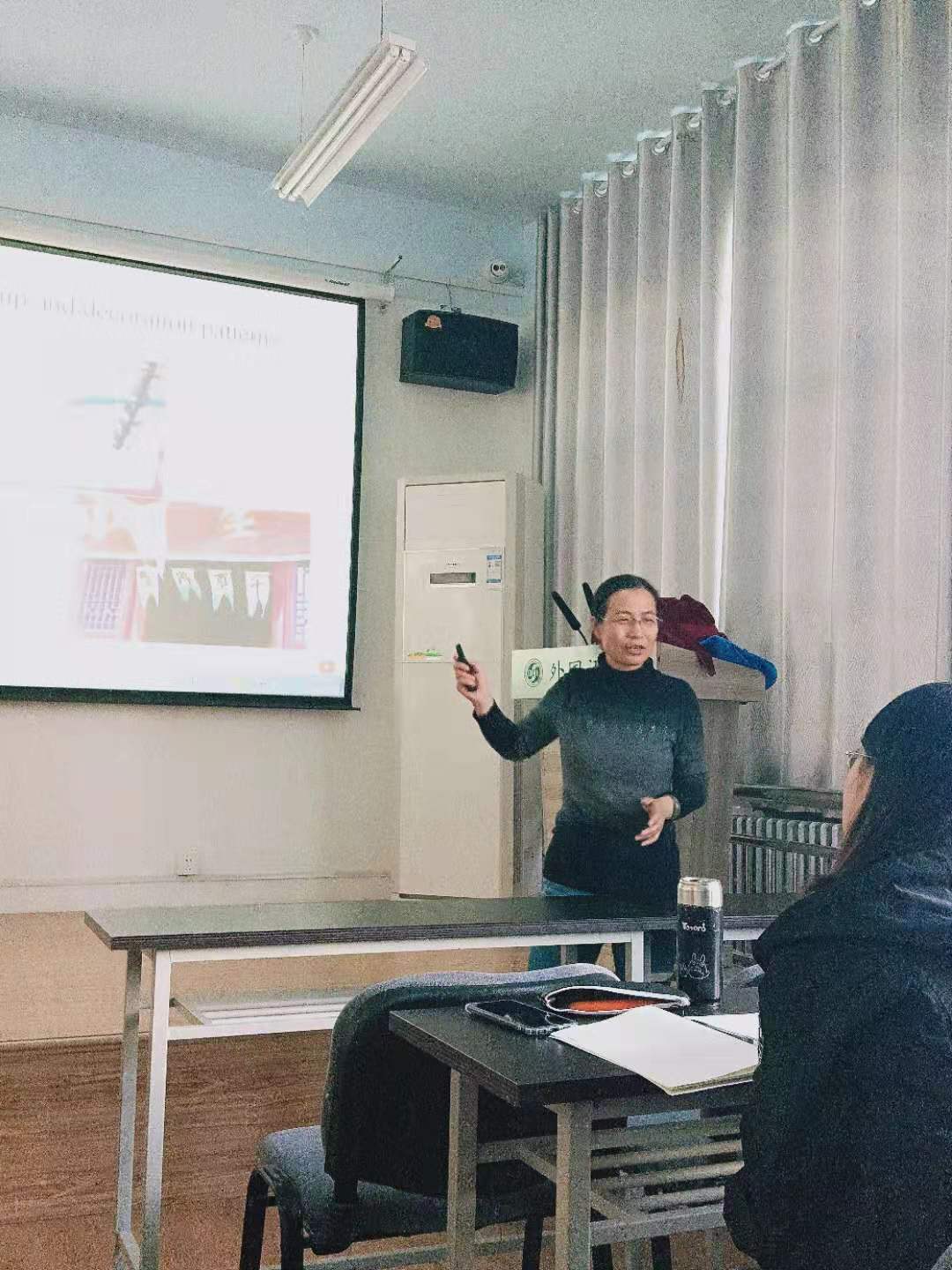 张老师以The Normality of Design Patterns in the Longzhong Paper Cut为题探讨了民间剪纸艺术的规约性。她分别从主题、颜色和样式三方面对陇中地区的剪纸艺术进行了细致的分析,向我们展示了陇中地区丰富的民俗文化,特别诠释了八角纹和“米”字纹、云冠和燕尾图等剪纸的符号意义以及时代演变的审美旨趣。剪纸艺术是我国非物质文化遗产之一,蕴含着文化基因和符号生命。师生们围绕相关问题进行了热烈讨论,获益颇多。