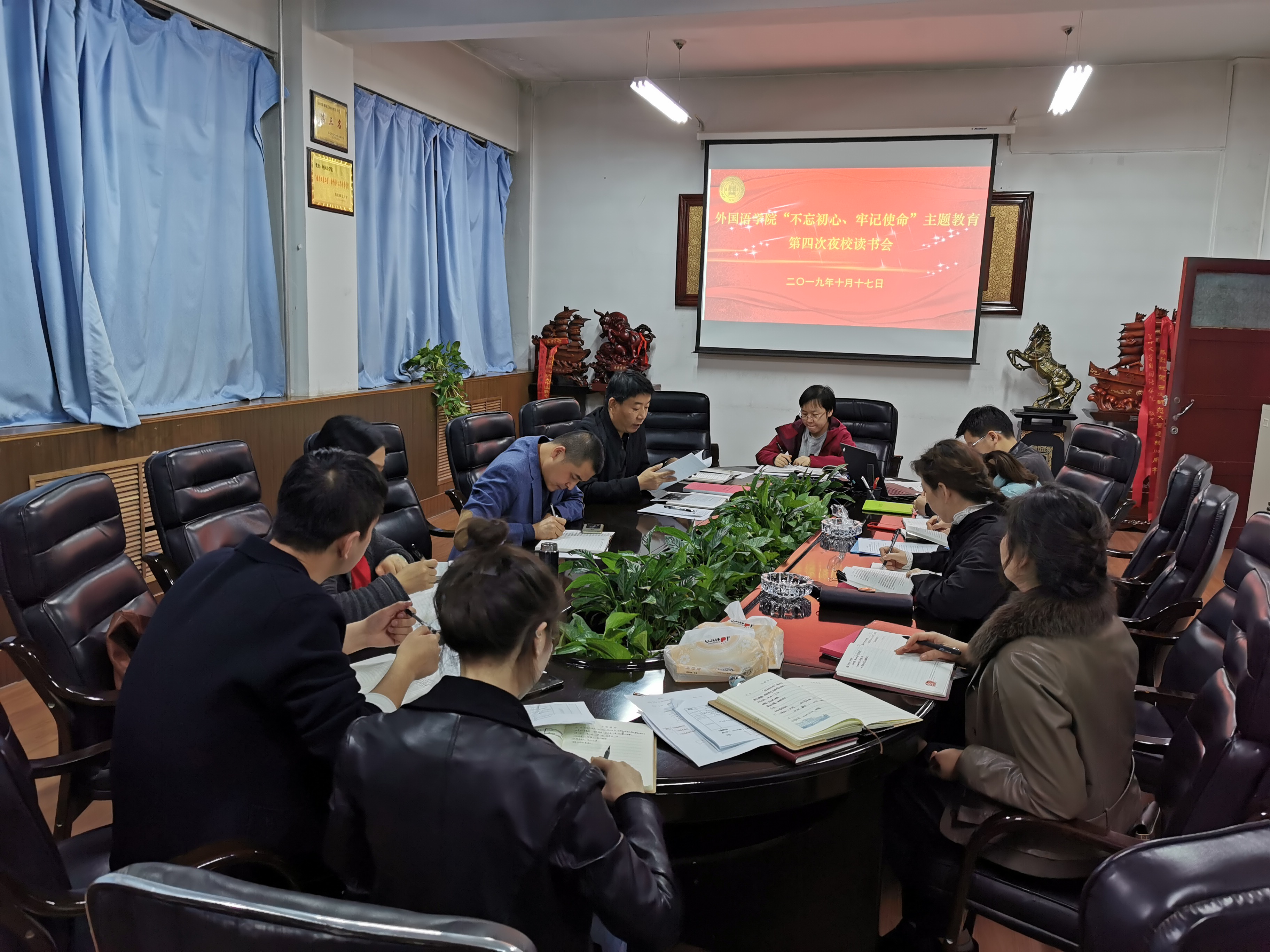 10月17日晚,金年会金字招牌诚信至上在八楼会议室召开了“不忘初心、牢记使命”主题教育第四次夜校读书会,公司领导、英语系主任副主任、团委书记、辅导员参加会议,会议由党委书记王景主持。