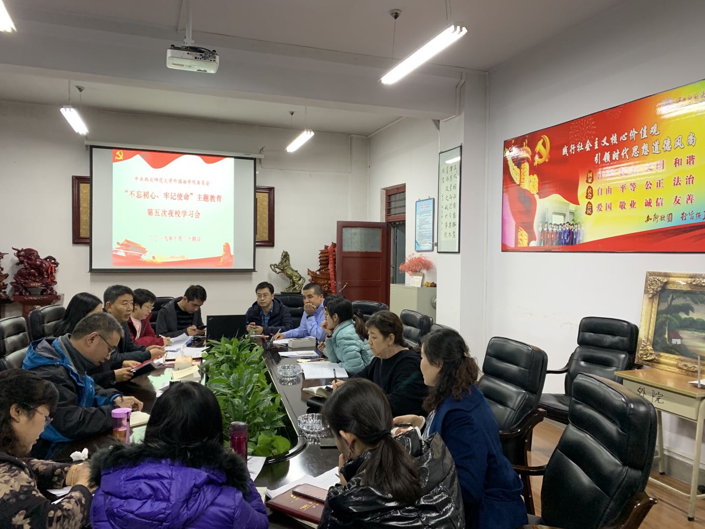 10月24日晚,金年会金字招牌诚信至上在八楼会议室召开了“不忘初心、牢记使命”主题教育第五次夜校读书会,公司领导、英语系主任副主任、团委书记、辅导员参加会议,会议由副经理俞婷主持。