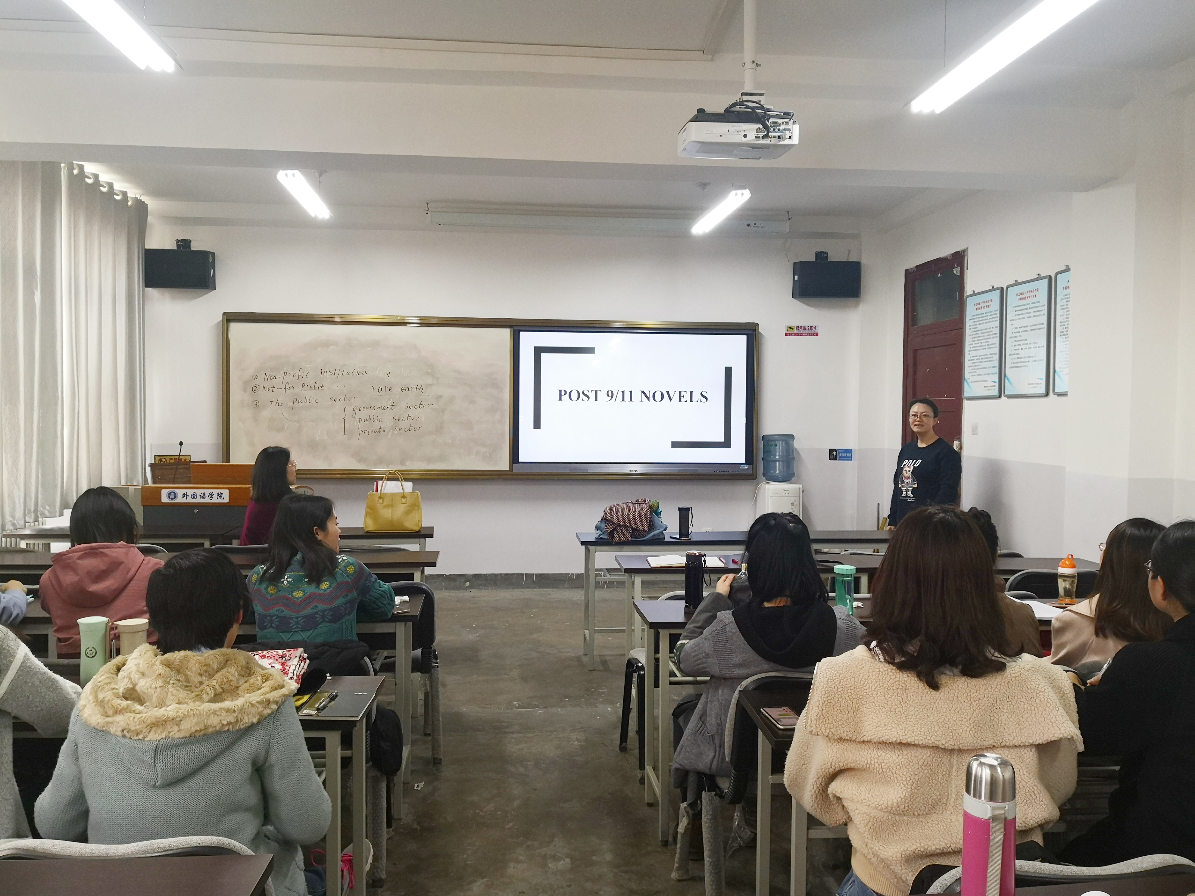 孙老师先简要介绍了相关作品的缘起、主要特征以及相关作家概论,然后主要以Don Delillo、Jonathan Sofran Foer和Cormac McCarthy这三位作家的代表作品对美国小说进行了生动介绍;接着孙老师与在场师生就相关小说与相关理论进行了互动与交流。