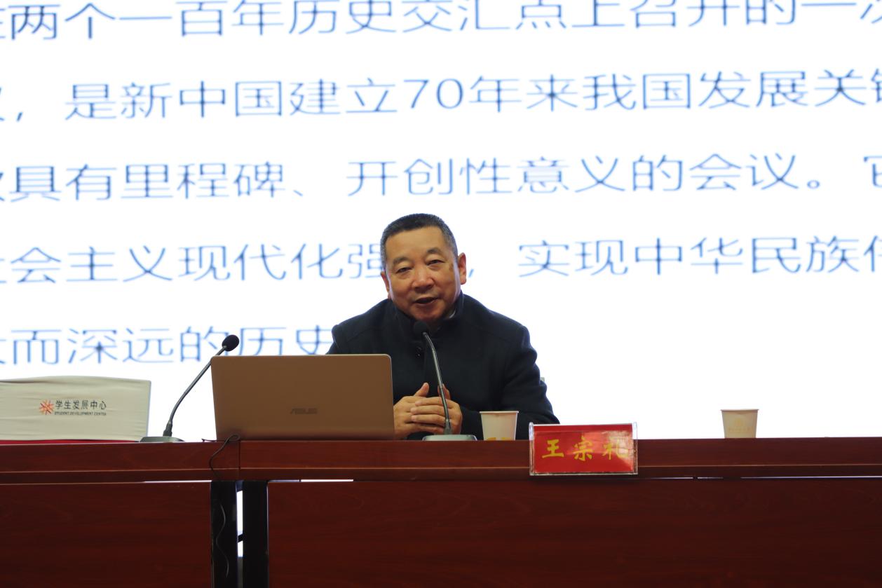 报告由马克思主义公司经理王宗礼教授主讲,他以《为实现中华民族伟大复兴提供坚实的制度保障——学习党的十九届四中全会精神的体会》为题,从制度建设:强国之路的根本保障、十九届四中全会的重大意义、中国特色社会主义是科学的制度体系、我国国家制度和治理体系的显著优势、推进国家治理体系和治理能力现代化、把我国的制度优势更好地转化为治理效能等方面,对党的十九届四中全会精神进行了全面而又深入的宣讲与解读。