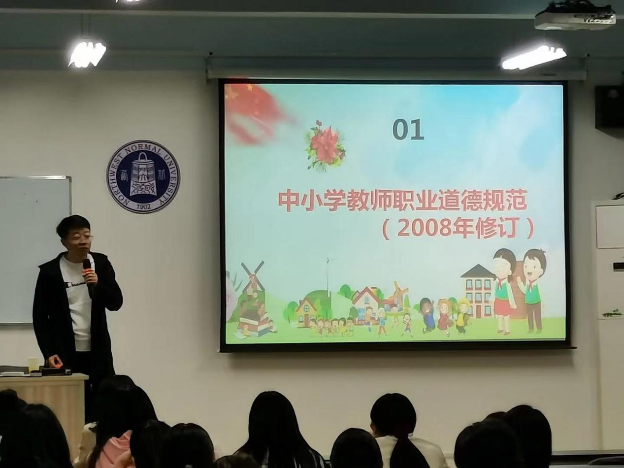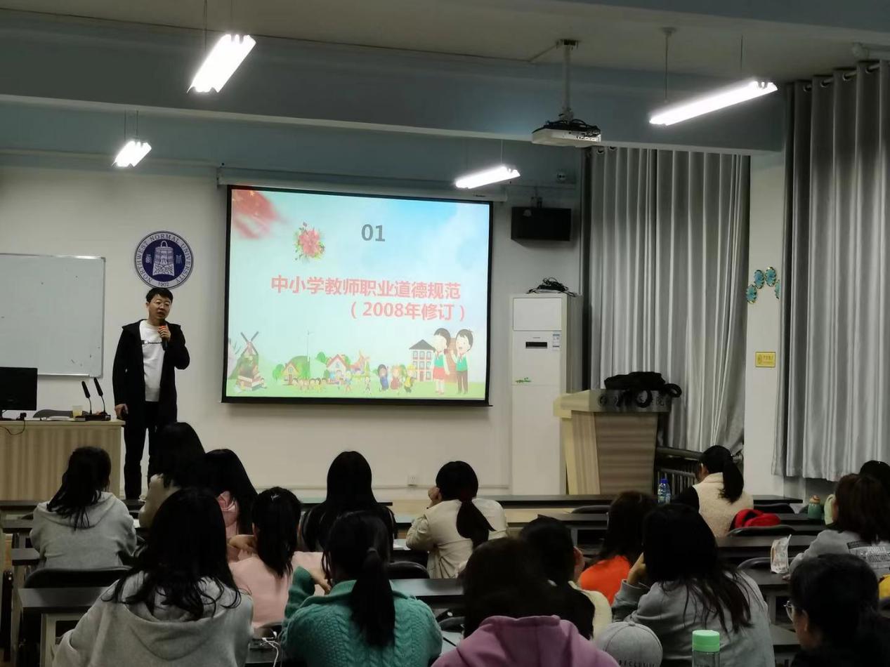 王老师首先结合自身的教学体验强调了实习老师的道德规范准则。随后具体阐释了教师礼仪的要求规范与重要性,其中具包括教师的举止服饰,手势的妙用与禁忌。“增强自信,抛弃自卑”被老师认为是成为受员工欢迎的老师的最重要的因素之一。他还指出,要成为一名合格的教师,心理情绪调节也必不可少,这就要求老师在每次生气之前都要三思而后行。