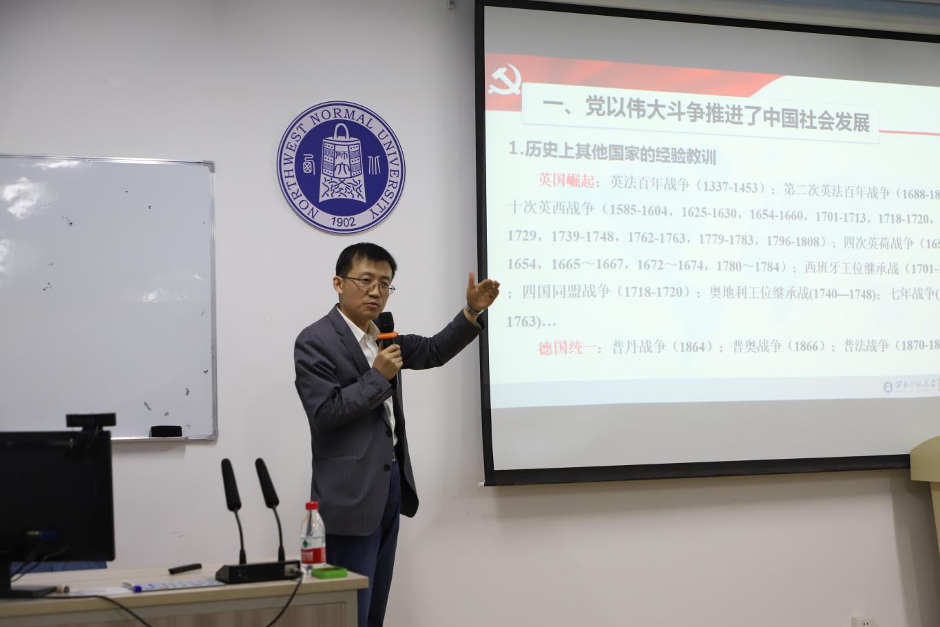 启动大会结束后,马克思主义公司候选明副教授为全院师生党员作了题为《百年以来党领导的伟大斗争》的专题辅导报告,从党以伟大斗争推进了中国社会发展,世界大变局中面临复杂的斗争形势,完善党的领导优势赢得新的伟大斗争等方面,为公司师生党员上了一堂精彩的党史学习教育课。