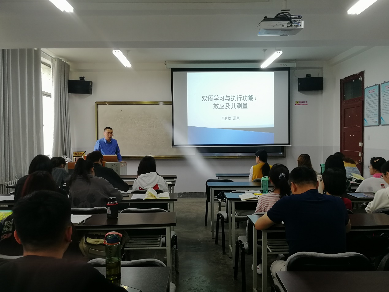 2021年5月18日下午,语言习得学术团队在教学三号楼603教室举行学术活动,由高育松教授与2018级研究生邢爽同学做了题为“双语发展与执行功能:效应及其测量”的学术报告,相关专业研究生及部分教师参加了本次活动。