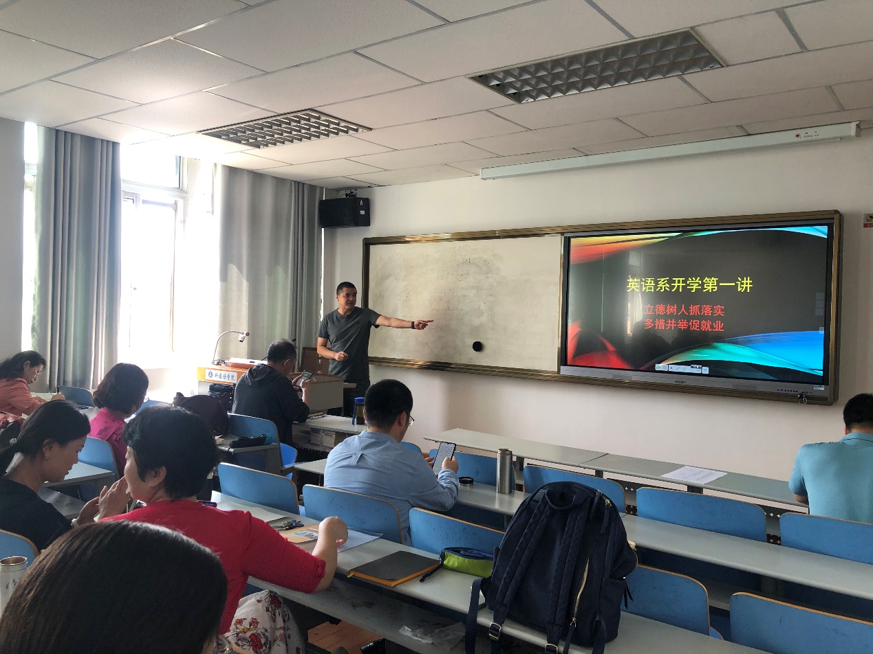 9月6日,英语系开展了“开学第一讲”教师教育活动暨新学期工作安排会,英语系全体教师出席,会议由英语系负责人王国礼主持。此次开学第一讲的主题为“立德树人抓落实,多措并举促就业”。英语系首先组织全体教师认真学习了教育部等七部门印发的《关于加强和改进新时代师德师风建设的意见》的通知,进一步明确了加强师德师风建设的总体要求、基本原则、核心内容和保障措施,并组织教师进行讨论。之后,全体教师又学习了国务院印发的《“十四五”就业促进规划》的相关内容。