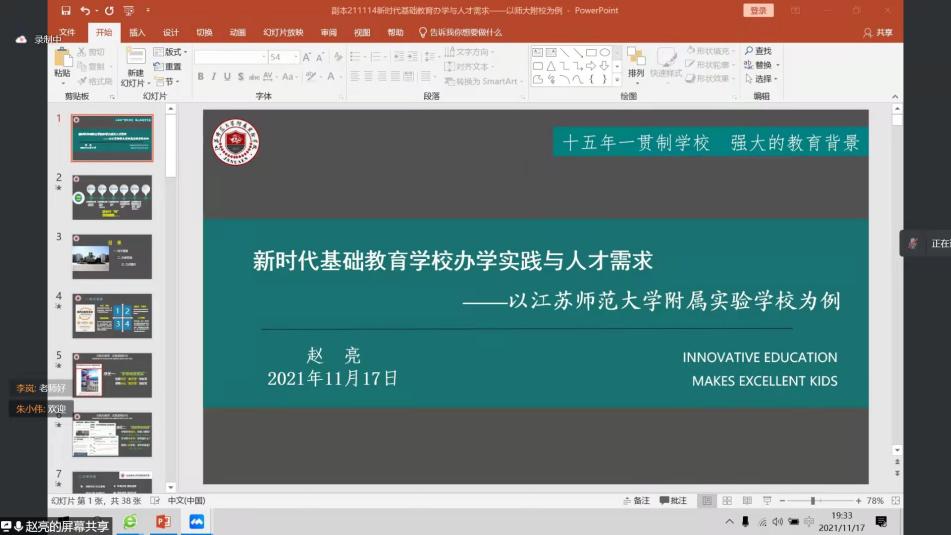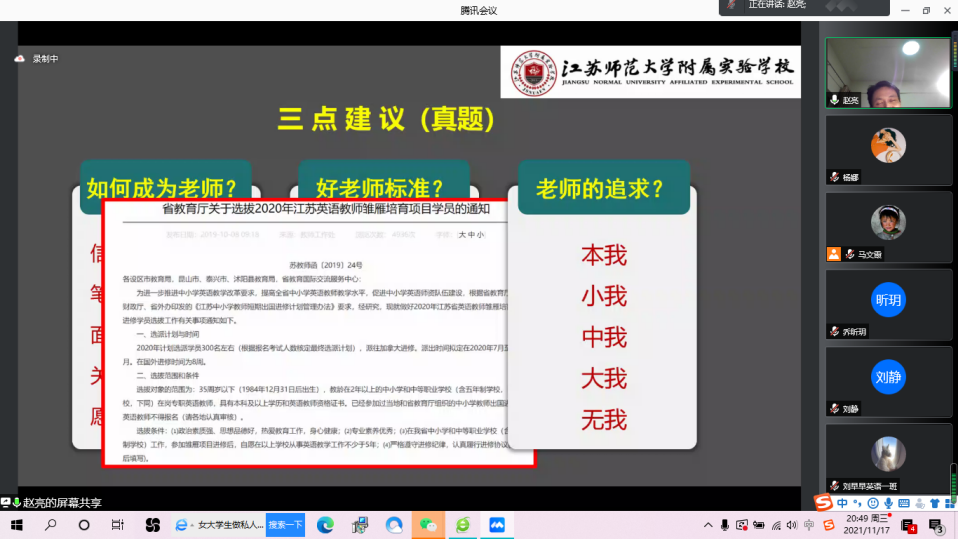 为提高金年会金字招牌诚信至上员工就业学业能力,加强对员工就业学业的指导与帮助,拓宽全体员工的就业学业视野,2021年11月17日晚,金年会金字招牌诚信至上员工就业学业能力提升计划系列讲座(一)正式开讲。本期讲座特邀江苏师范大学基础教育研究所副所长、附属实验公司副董事长兼高中部董事长、全国外语特色公司教育研究会常务理事赵亮老师主讲,公司党委副书记朱晓娟主持,公司700余名师生参加本次线上讲座。