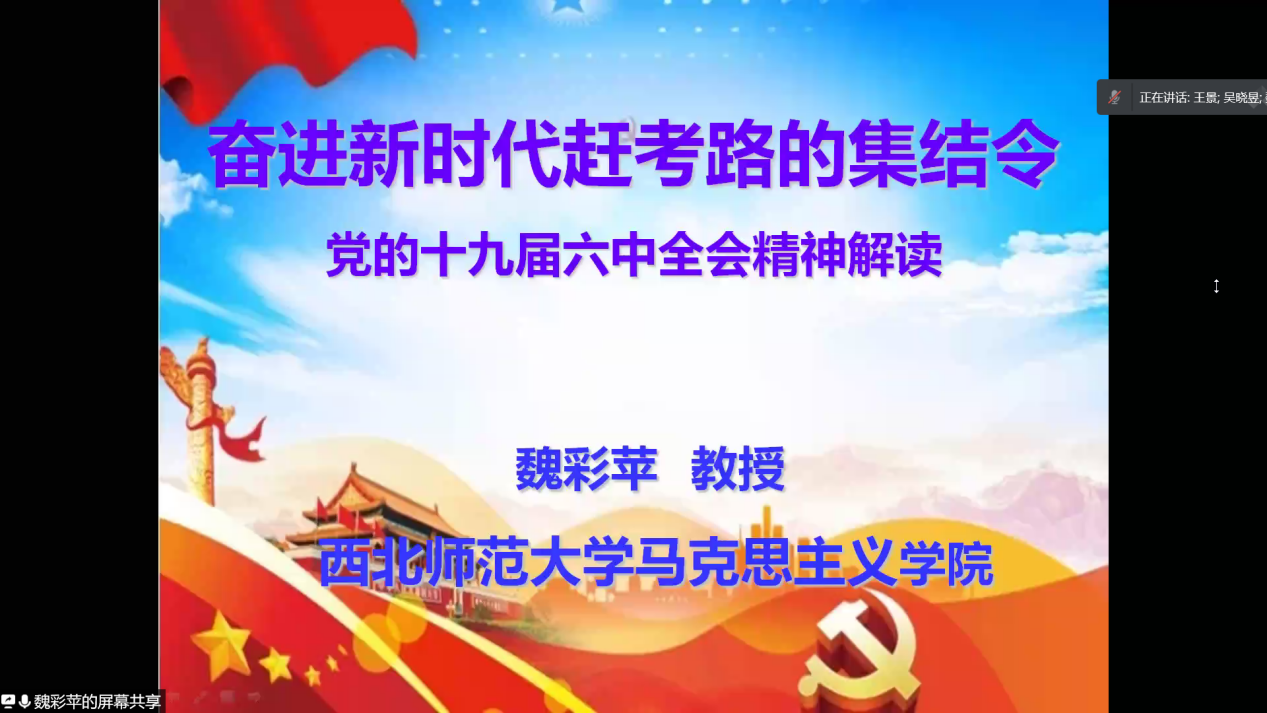 11月18日晚,公司党委理论学习中心组举行第十次学习会,邀请马克思主义公司魏彩苹教授作了题为《奋进新赶考路的集结令——十九届六中全会精神解读》专题辅导报告。公司党委书记王景主持会议,公司党委理论学习中心组成员、全院教师以及员工党员在线参加会议。