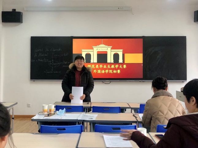 院级选拔赛分模拟授课、实习话感想两部分进行。每位选手模拟授课时间为15分钟,实习话感想3分钟,模拟授课就教学设计与多媒体课件制作、教学内容、教学方法等方面进行展示。比赛中,选手们思路清晰、语言流畅、教法灵活多样、教态自然大方,展现出英语专业师范毕业生的风采。
