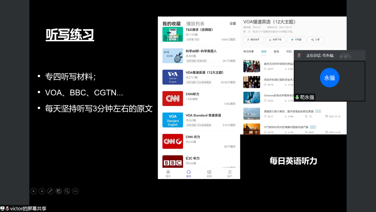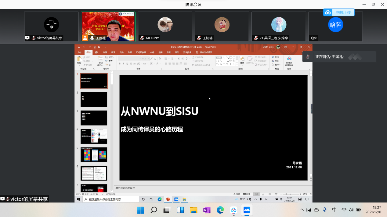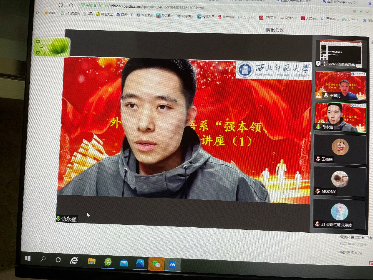 为强化员工专业能力,提升就业水平,英语系于2021年12月8日晚邀请2016级优秀毕业生苟永强为员工进行专题讲座:从NWNU到SISU,成为一名同传译员的心路历程。