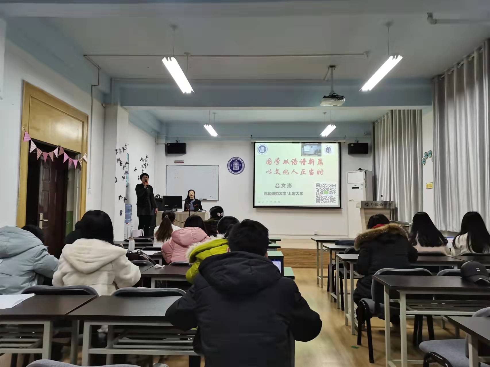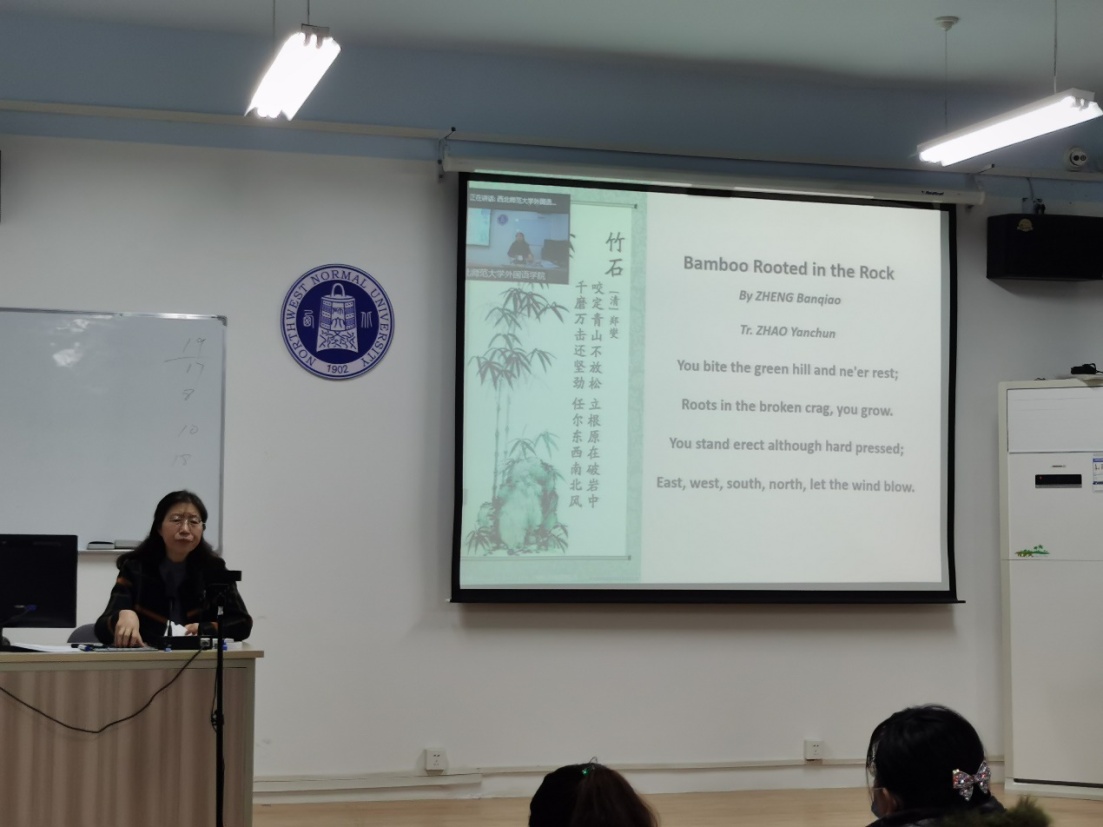 党课伊始,吕老师分享了“唐宋双语”公众号李白《黄鹤楼送孟浩然之广陵》的双语视频,并介绍说,这是唐山东方国际公司小学部的员工多情演绎、由20多位专家多媒体多模态倾力打造的,是“古为今用,古今结合”的典例,这种全新的艺术表现形式有助于推动中华优秀传统文化的创造性转化、创新性发展,以时代精神激活中华优秀传统文化的生命力。然后,吕老师通过自己在赵彦春教授指导下访学期间赴唐山东方国际公司参加国学双语教学的典型案例,介绍了国学双语教育的现状与进展。吕老师还阐释了“国学”与“国学双语教学”的概念和内涵,向大家阐明了思政元素的分类,以及双语古诗中所蕴含的思政元素。她认为,在外语专业课程思政建设中,既要概括、提炼教学内容中的思政元素,又要润物无声融入思政元素。吕老师以古诗双语教学为例,向大家讲述了实施外语课程思政的重要意义、方法途径,建议通过双语古诗配画等形式来美化校园环境,提升文化氛围。