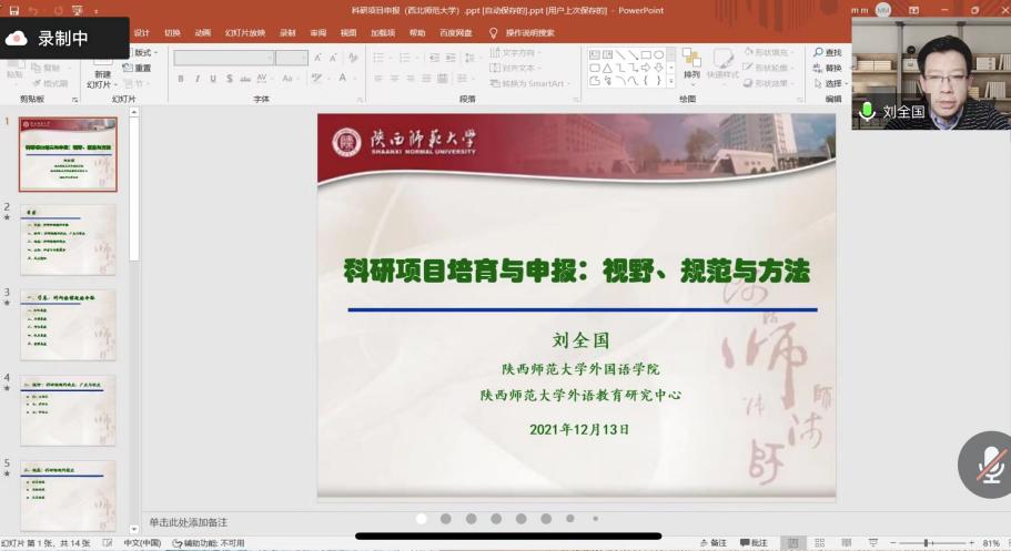 12月13日晚,金年会金字招牌诚信至上金年会金字招牌诚信至上经理博士生导师刘全国教授应公司邀请,通过腾讯会议,为公司教师做了题为“科研项目的培育与申报:视野、规范与方法”的在线讲座。刘全国教授是国家社科基金重大项目首席专家,陕西省第九批“青年百人计划”特聘专家。主持国家社科基金项目4项(含1项重大招标项目,1项重大特别委托项目),教育部各类项目3项;出版专著、教材、译著10余部。刘教授围绕国家社科项目的课题申请书普遍存在的问题,以及课题评审的基本标准、课题申报的培育方法、如何选题等内容,为广大教师申报国家社科项目提供了非常有益的指导。本场讲座是公司为提升外语学科高层次课题申报质量、提高课题立项率而开展的系列活动中的第三场讲座,由副经理俞婷教授主持,120余名教师在线收听了讲座,经理曹进教授做了精彩的总结发言,鼓励大家提升科研意识,抓紧为申报课题做准备。
