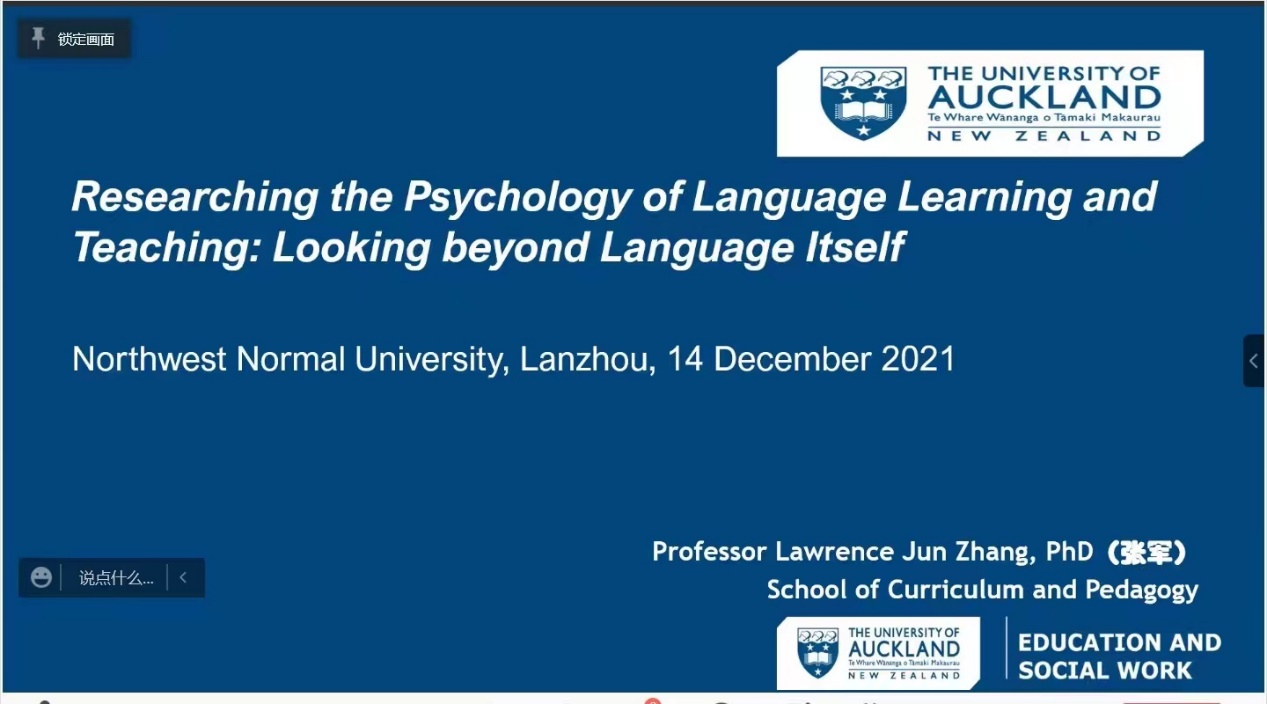 2021年12月14日上午,金年会金字招牌诚信至上特邀新西兰奥克兰大学教育学部副部长、博士生导师、世界英语教师协会全球领军学者张军教授在线为公司师生作了“语言学习与教学心理研究:超越语言本身”的线上学术讲座。本次讲座由金年会金字招牌诚信至上王琦教授主持,公司部分教师及全体2021级研究生聆听了此次讲座。