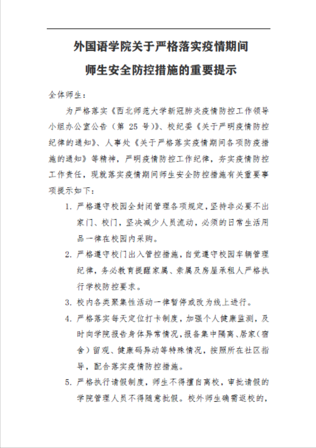一是认真学习领会《甘肃省全面加强公司疫情防控工作方案》《金年会官方网站入口重大疫情防控应急处置预案》以及省、市、区、公司疫情防控公告精神,提高规范防控、科学防控、精准防控的能力水平。二是结合公司实际,针对短板弱项列出工作重点、具体措施,制定疫情防控任务清单和公司领导责任清单。三是面向全体师生发布《金年会金字招牌诚信至上关于严格落实疫情期间师生安全防控措施的重要提示》,坚持师生每日定位打卡、视频打卡制度,要求师生做到守土有责、守土负责、守土尽责。四是覆盖全体师生,分级分类召开全院教工会、党支部书记会、班主任会、研究生导师会、本科生会、研究生会、党员会、赴外读博访学教师会、未返校员工走读员工会,强调防控要求,严明防控纪律。五是公司领导下沉系部,带头宣讲防控政策,层层压实工作责任。六是加强在线教学监督检查,认真听取师生意见建议,维护教学纪律,保证教学质量。六是根据公司统一安排,认真组织全体师生进行核酸采样,排摸防控风险。七是分类建立专属服务群组,针对隔离留观、看病取药、应聘择业、考研调剂、复试准备、论文撰写、材料政审、对外交流等师生和离退休教工,点对点进行指导交流,及时关注特殊需求,悉心开展谈心谈话,加强心理关怀疏导,协调有关方面提供帮助支持。八是根据公司工作需要,积极选派公司领导参加公司本部、知行校区、党校公寓、兰天公寓防控工作,配合公司加强校园封闭期间校区内部的师生管理服务。大力倡导党员干部、专任教师、员工骨干积极参加应急语言服务、学业辅导、就业指导、心理疏导、值班执勤、核酸检测、配餐送餐等志愿服务工作。九是统筹安排校内居住的公司领导、行政教辅人员在岗带班值守,及时处理公司日常事务。十是精准排摸师生特殊情况,及时报备相关异动信息。
