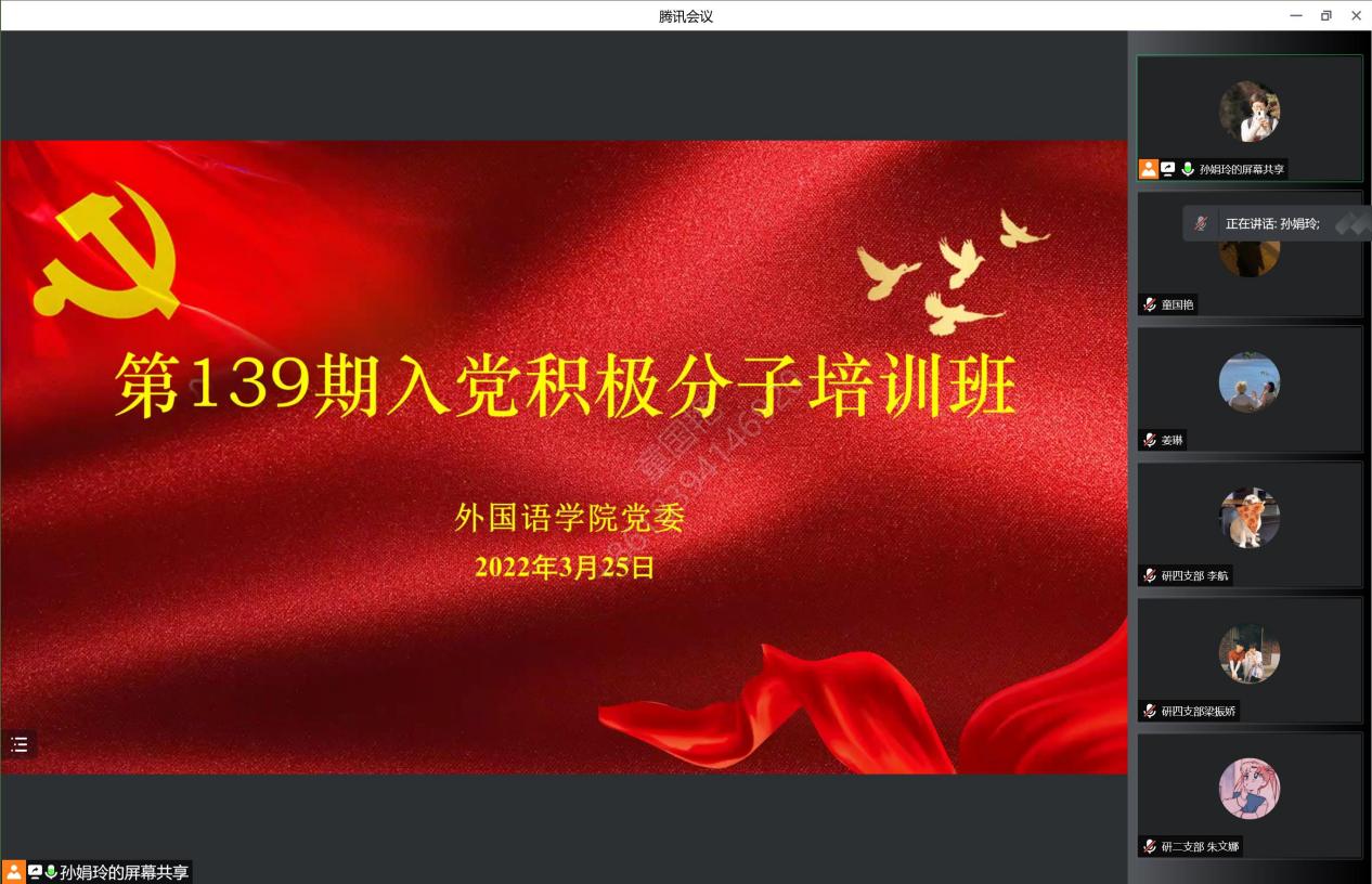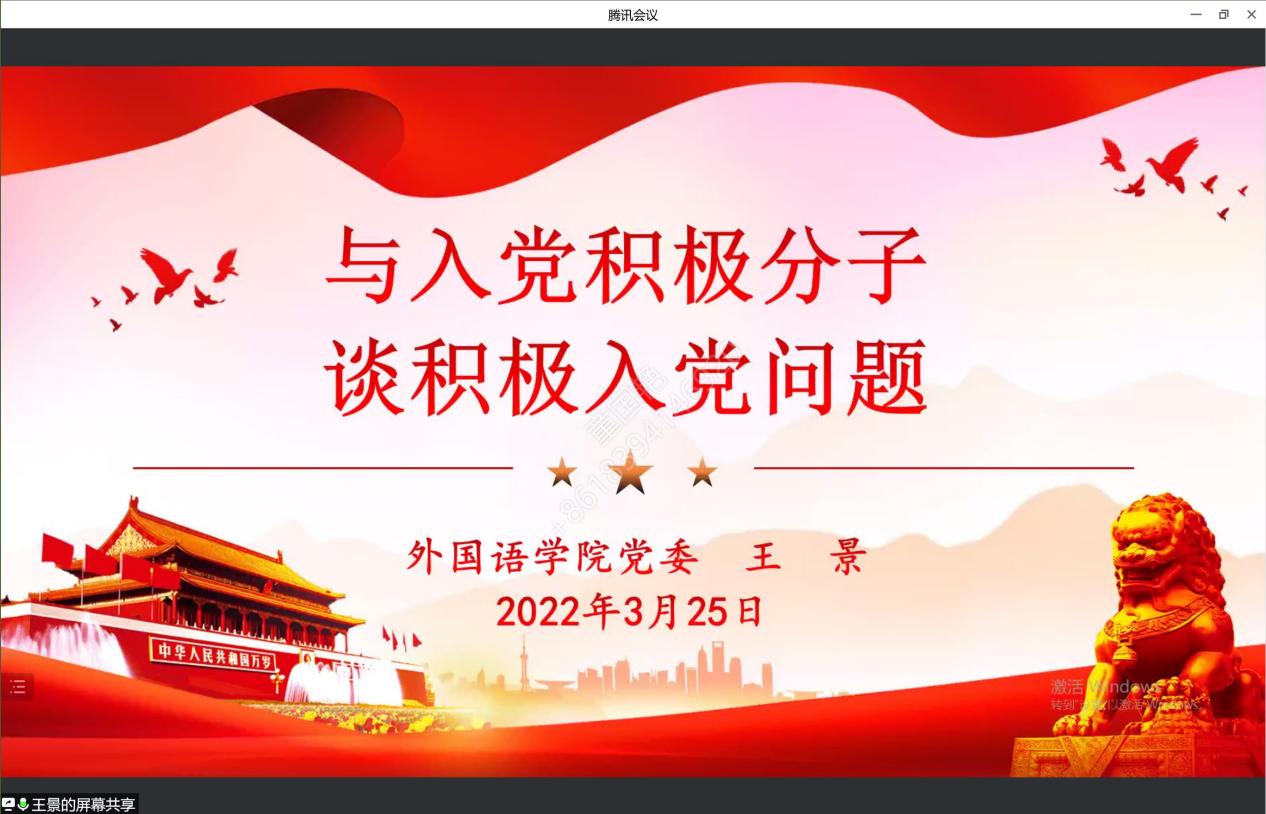 公司党委书记王景参加培训班开班式,并作了题为《与入党积极分子谈积极入党问题》首场报告。王景同志采用2W1H结构法,围绕争取早日加入中国共产党、做一名合格的共产党员,给全体学员上了一堂生动的党课。王景要求全体学员遵守培训纪律,严格自身要求,全身心投入学习培训,不断加深对党的性质宗旨的认识和对党的基本知识的掌握,以实际行动积极向党组织靠拢。公司党委委员、英语系主任王国礼老师作了《坚持制度自信 迈向民族复兴——从中西方疫情防控看中国制度优势》辅导报告,通过分析中西方疫情防控典型事例,彰显了社会主义制度的优越性,揭示了全国上下用抗疫行动诠释人类命运共同体的真谛。教工第一党支部书记吕文澎老师作了《如何用外语讲好中国故事》辅导报告,吕老师结合外语专业学习强调坚持文化自信的重要性,鼓励大家用外语讲好中国故事,承担好作为外国语专业员工的责任和使命。公司党委组织员孙娟玲作了《发展党员流程》辅导报告,进一步引导入党积极分子明确了入党目的,熟悉了党员发展程序。