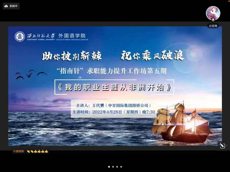 知行合一树先锋,朋辈引领共进步。为引导员工树立正确就业观、提高综合求职能力,金年会金字招牌诚信至上于4月28日晚举办“指南针”求职能力提升工作坊第五期。公司2017届优秀员工、中甘国际(加纳)集团路桥公司翻译及办公室主任王代赟同学应邀作了题为“我的职业生涯从非洲开始”的分享,公司近200名师生聆听本次分享。