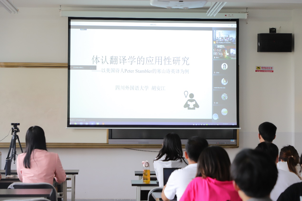 讲座伊始,胡安江教授对应用翻译研究话语体系进行了初步介绍,并指出各部分之间的密切关系。胡教授将马克斯·韦伯的“价值中立”与现实关怀联系起来,强调应突出翻译研究的现实关怀维度,促进翻译研究的成果转化。接着,胡教授阐述了中国特色对外话语体系在对外译介与传播过程中存在的“四种缺失”、“四大困境”与“五种不到位”等认识论和方法论问题。随后,胡教授分析了体认翻译学的理论建构,并以体认翻译学为话语视角探讨译者在翻译过程中对于物理世界的“体验互动”和心智世界的“认知加工”。在此基础上,胡教授分析了美国诗人翻译家Peter Stambler的三首英译诗,并指出由于对关键概念和核心术语在识解方式上的体认差异,译者的译诗会呈现不同的语境效应、文体风格和美学效果。