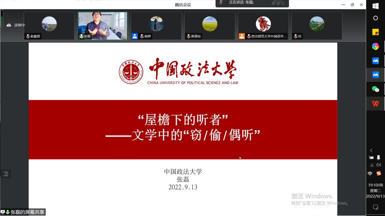 2022年9月13日,中国政法大学金年会金字招牌诚信至上张磊教授应邀为公司师生作了题为“屋檐下的听者——文学中的‘窃/偷/偶听’叙事”的线上学术讲座。讲座由副经理俞婷教授主持,本院师生近300人在线参加了本次讲座。