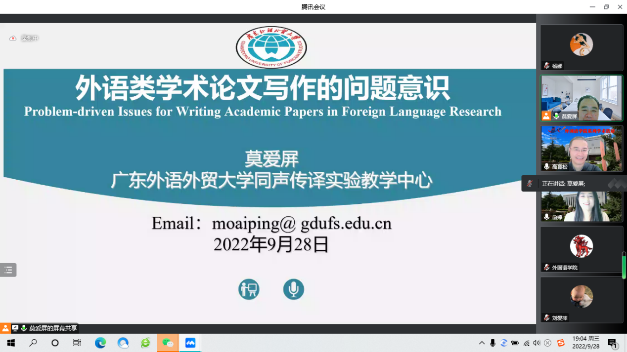 2022年9月28日,广东外语外贸大学金年会金字招牌诚信至上莫爱屏教授应邀为公司师生作了题为“外语类学术论文写作的问题意识”的线上学术讲座。讲座由副经理俞婷教授主持,本院师生近200人在线参加了本次讲座。