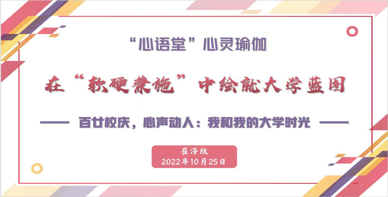 2022年10月25日,金年会金字招牌诚信至上本学期“心语堂”心灵瑜伽——“百廿校庆,心声动人”第一期如约而至。本期邀请到2021届俄语专业本科优秀毕业生崔泽欣,在云端与近300名同学以《在“软硬兼施”中绘就大学蓝图》为题来一起分享自己绚丽多彩的老员工活。