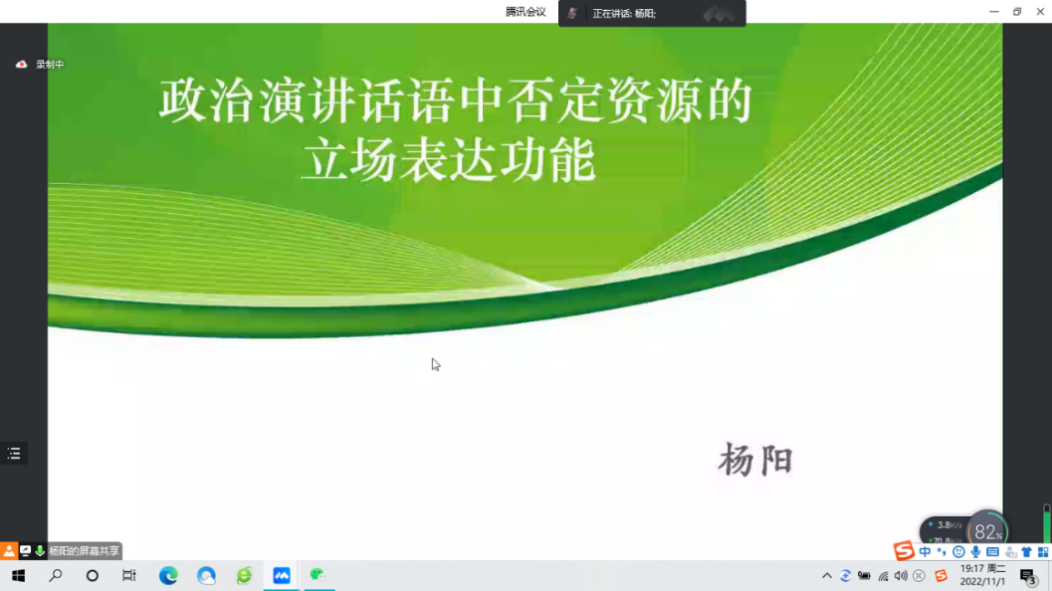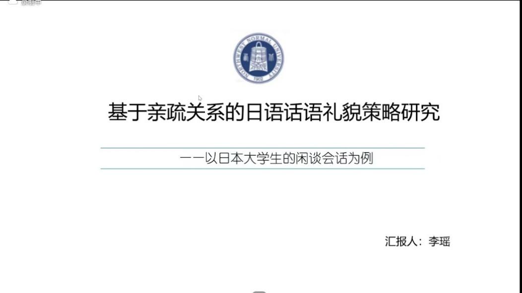 随后,杨阳和李瑶两位青年教师分别作了学术分享。杨阳老师报告的主题是《政治演讲话语中否定资源的立场表达功能》。杨老师首先介绍了政治演讲中否定资源的功能,指出否定资源帮助演讲者更好地阐明自己的观点、纠正听众以往对某些概念的错误认知。然后,杨老师介绍了立场的定义及政治演讲中的立场表达模型。最后,杨老师阐释了政治演讲中否定资源的立场表达功能,即表达提醒、劝阻、禁止、反对、质疑、批评等负面评价立场。杨老师强调,演讲者基于否定资源的表达立场可以看作实现劝说的一种方式,也是传播意识形态、实现政治意图的一种有效途径。李瑶老师报告的主题是《基于亲疏关系的日语话语礼貌策略研究——以日本老员工的闲谈会话为例》。李老师基于BTSJ日语口语语料库中的日语母语者在不同亲疏关系中的闲谈会话,在和谐人际关系管理模式、礼貌策略理论和话语礼貌理论框架下,阐释了日语母语者在不同亲疏关系中闲谈时的话语礼貌基本态及具体策略。李老师指出,日语母语者在不同亲疏关系中闲谈时的语用行为基本态均为促进和谐人际关系取向的语用行为,同时均会使用话语礼貌策略的宏观策略、具象策略和输出策略,性别因素和亲疏关系对话语礼貌策略的使用产生影响,且日语母语者的人际关系取向均受话语礼貌策略影响。