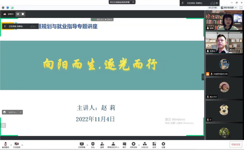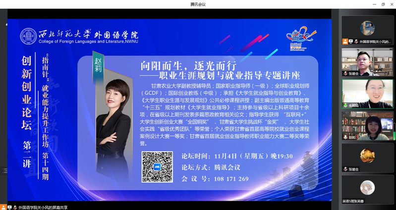 为帮助金年会金字招牌诚信至上员工做好职业生涯规划,适应就业新形势,11月4日晚,金年会金字招牌诚信至上“创新创业论坛”暨“指南针”就业能力提升工作坊系列活动如期开展。本期邀请到甘肃农业大学副教授辅导员赵莉,为同学们带来精彩的“向阳而生,逐光而行——职业生涯规划与就业指导”专题讲座,公司党委副书记朱晓娟主持,近300名师生线上聆听讲座。
