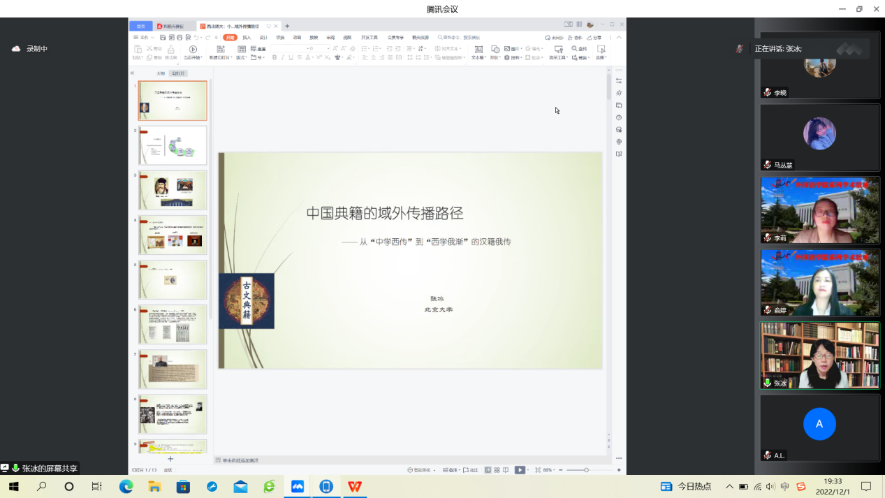 2022年12月1日,北京大学俄罗斯文化研究所张冰研究员应邀为公司师生作了题为“中国典籍地域外传播路径”的线上学术讲座。讲座由李莉副经理主持,本院师生近150人在线参加了本次讲座。